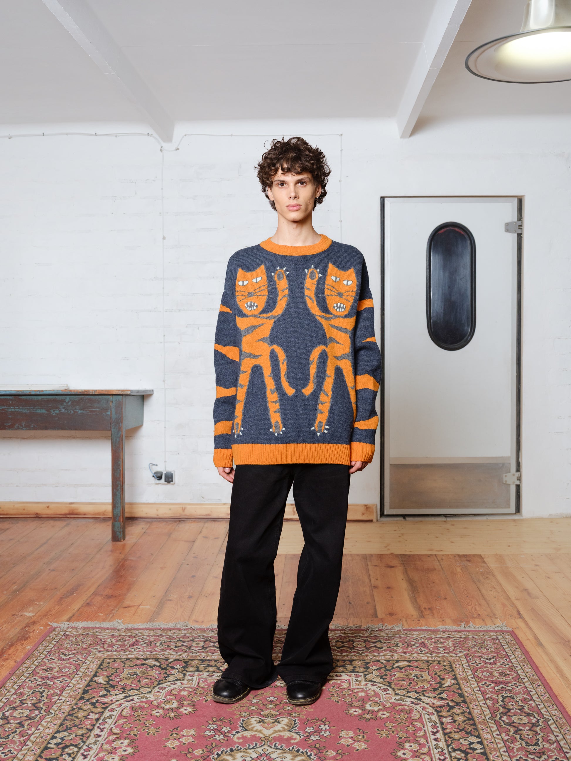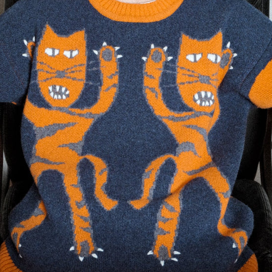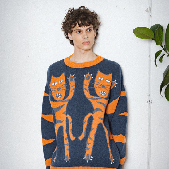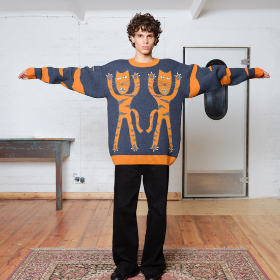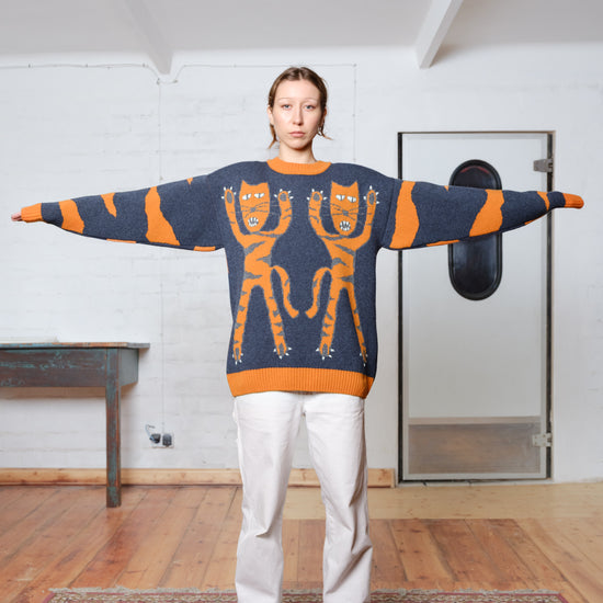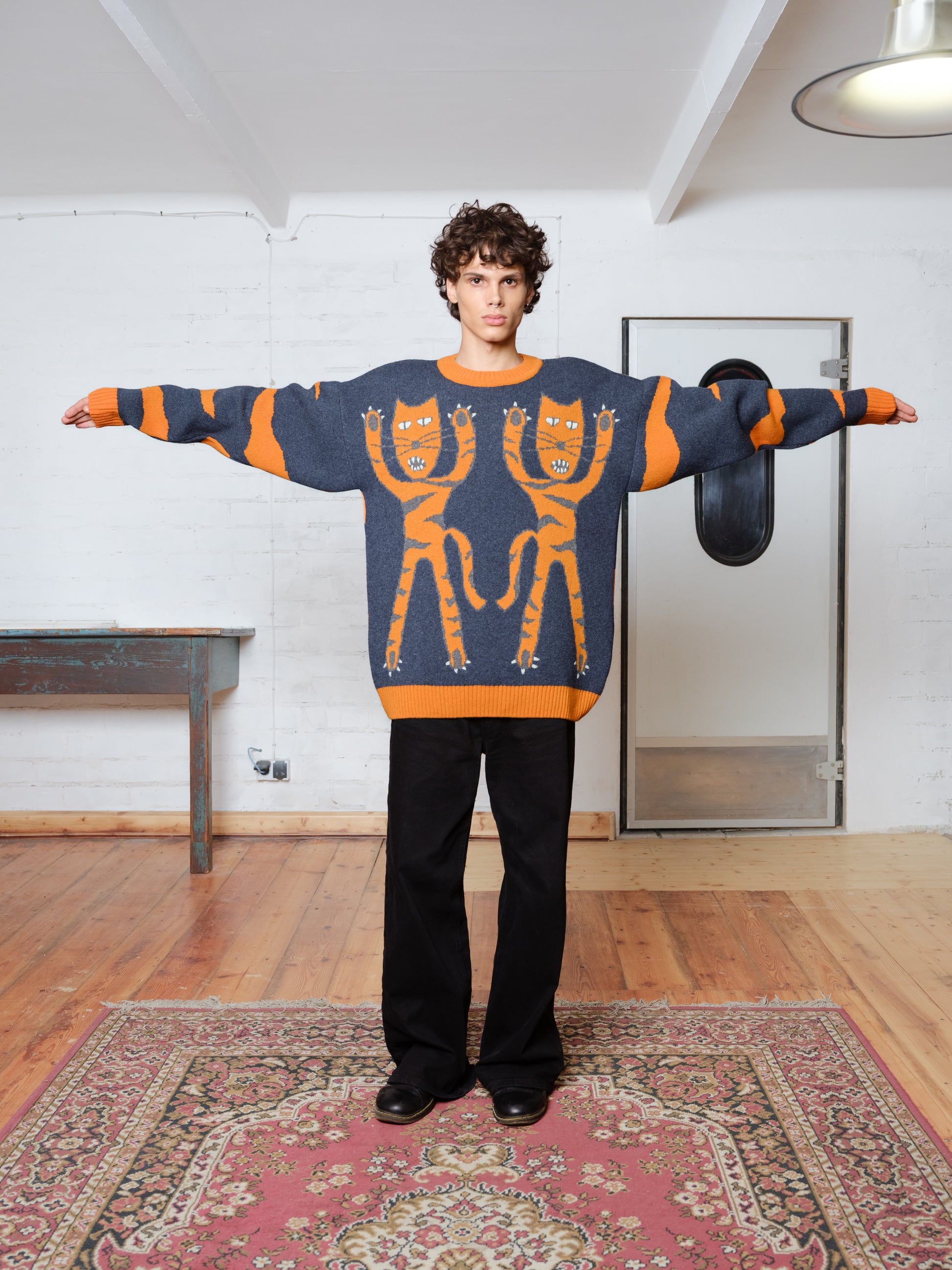Made from 100% extrafine Italian lambswool, this sweater is soft to the touch, cozy without weight, and naturally breathable. Its oversized, unisex shape is brought to life with rich tones and a playful hand-drawn kitten design, making it a standout piece for everyday style.