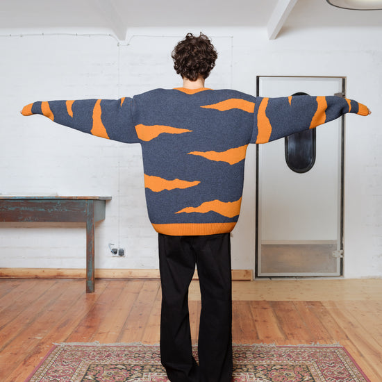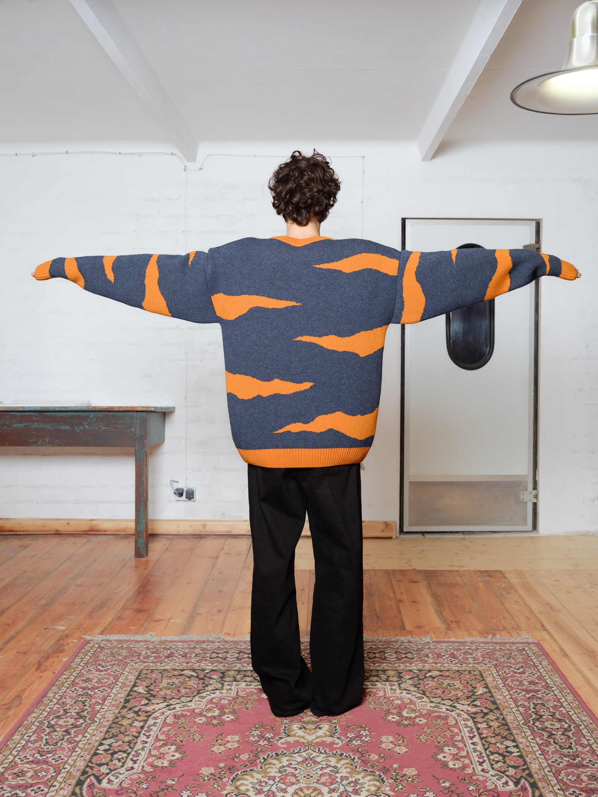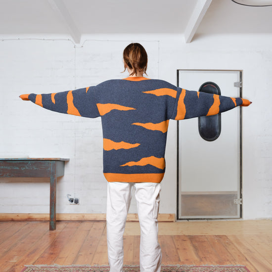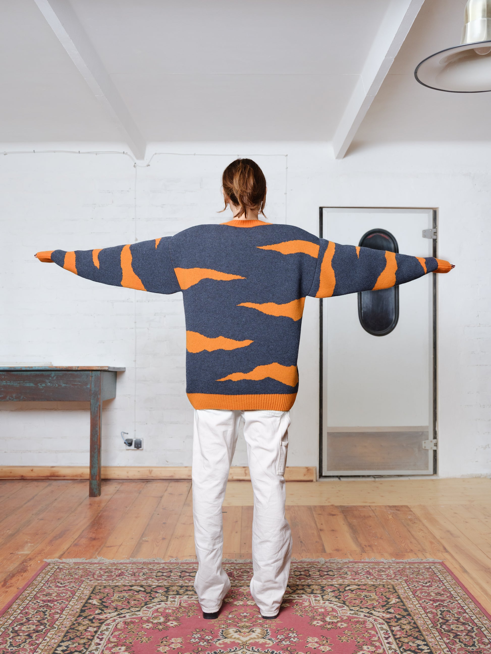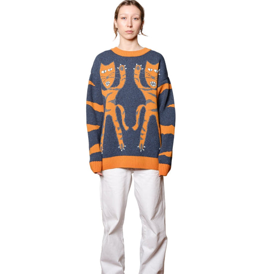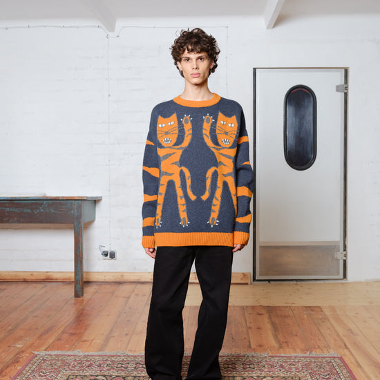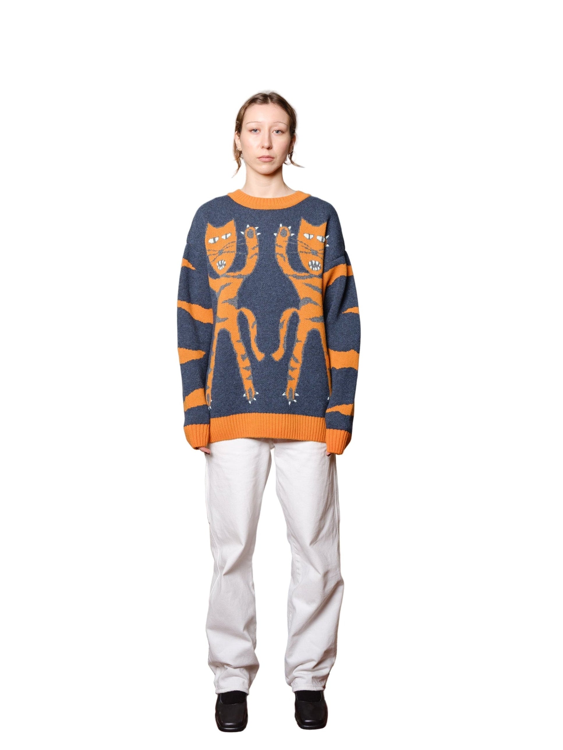 Made from 100% extrafine Italian lambswool, this sweater is soft to the touch, cozy without weight, and naturally breathable. Its oversized, unisex shape is brought to life with rich tones and a playful hand-drawn kitten design, making it a standout piece for everyday style.
