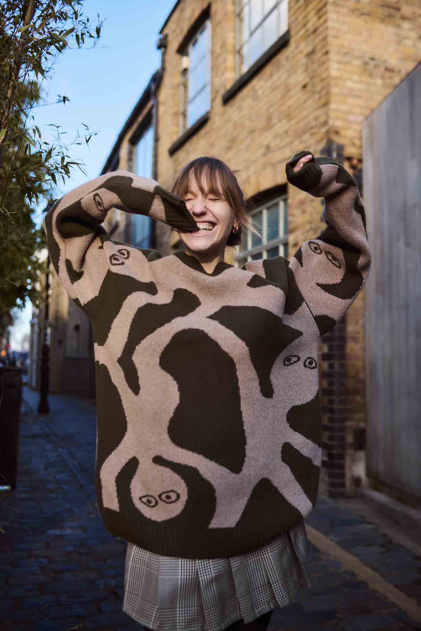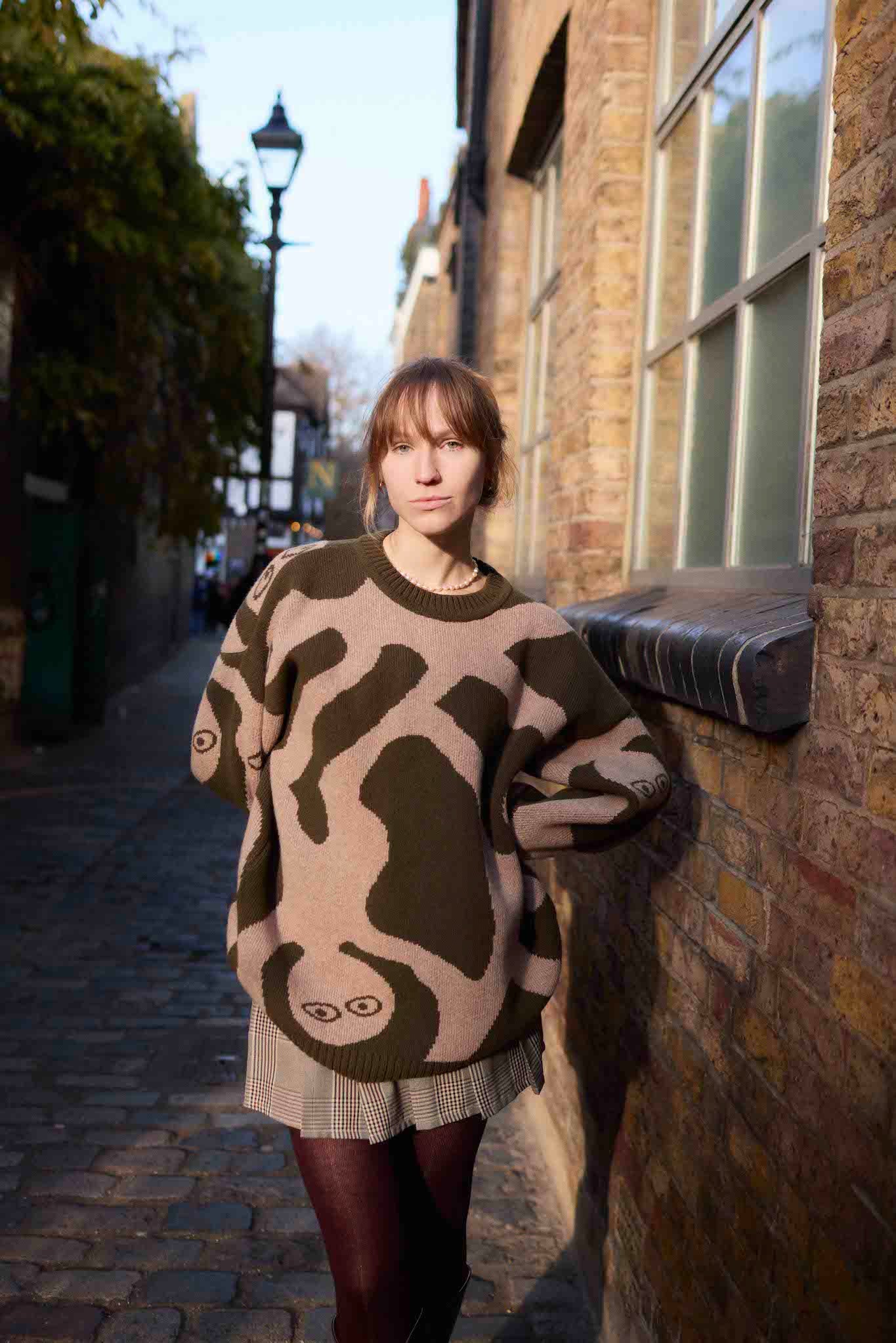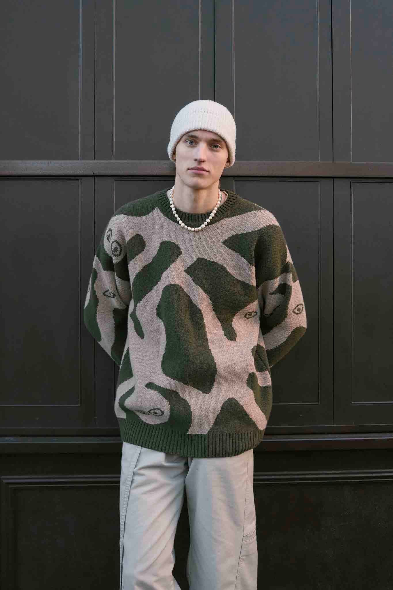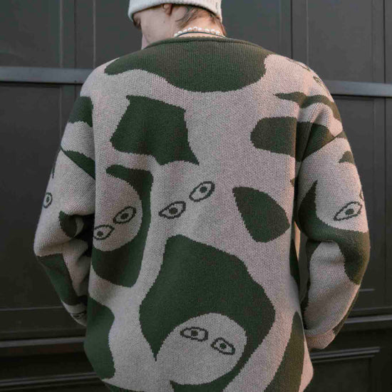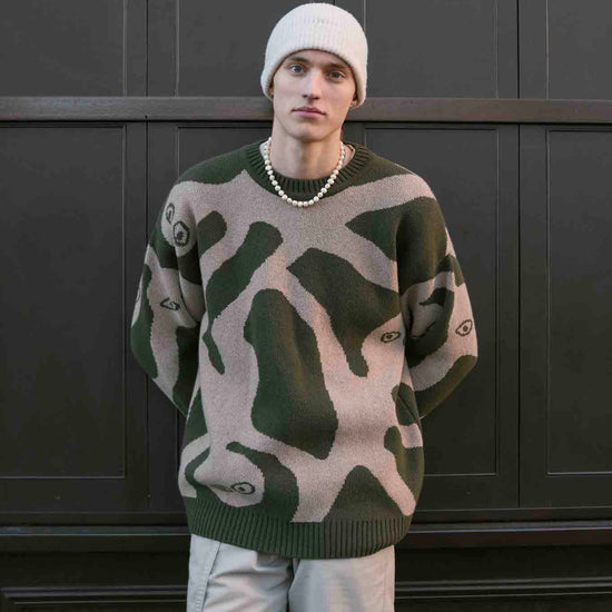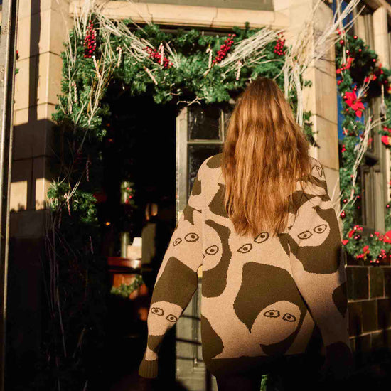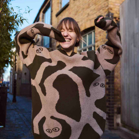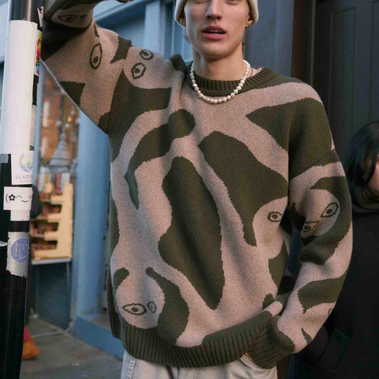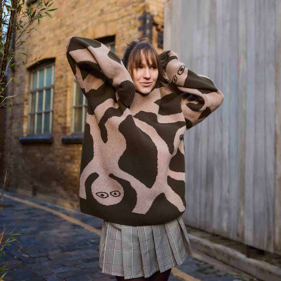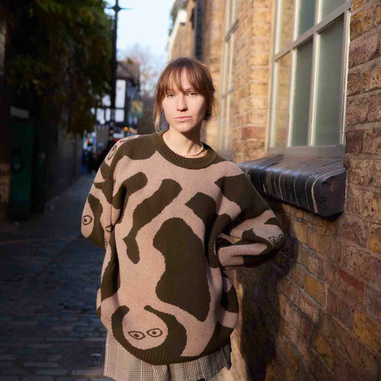 Made from 100% extrafine Italian lambswool, this sweater is soft to the touch, cozy without weight, and naturally breathable. Its oversized, unisex shape comes alive in earthy tones with a unique hand-drawn design, making it a standout piece for everyday style.